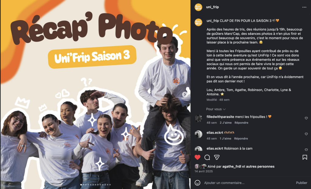 Le projet Uni’Frip s’inscrit dans le cadre du Projet Tutoré de deuxième année à l’IUT Infocom de Besançon pour l’année universitaire 2024-2025. Cette initiative solidaire et éco-responsable vise à promouvoir la seconde main en milieu étudiant, tout en facilitant l’accès à l’habillement à prix réduits. En tant que Community Manager de l’équipe, j’ai été au cœur de la stratégie de communication, avec pour objectif principal de fédérer une communauté active autour des valeurs de durabilité et d’entraide.